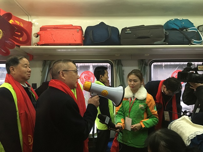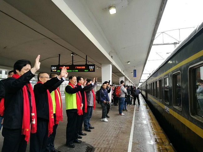 1月13日,随着列车的鸣笛声,广东省湖北商会2017暖冬行动•爱心专列从广州火车站开出,一路向北,直达武昌站。这趟载满爱心的专列让1500名湖北籍在粤务工人员开心地踏上返乡旅途。省工商联副主席张宏斌出席了发车启动仪式并讲话。广东省社会组织管理局副局长徐祖平、共青团广州市委员会副书记孙柱、湖北省人民政府驻广东办事处副主任牟松等嘉宾出席活动。